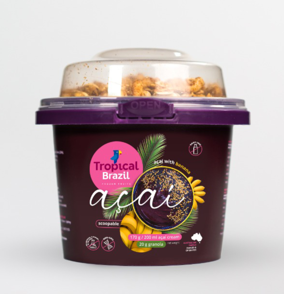 The 190g Grab and Go is an excellent way to start a day or an arvo snack, the package size come with 170g of Acai Cream plus 20g of a crunchy granola, also a spoon in a box with 12 units. For sure, your customer will just Grab and Go to eat a delicious Acai with Banana flavour.